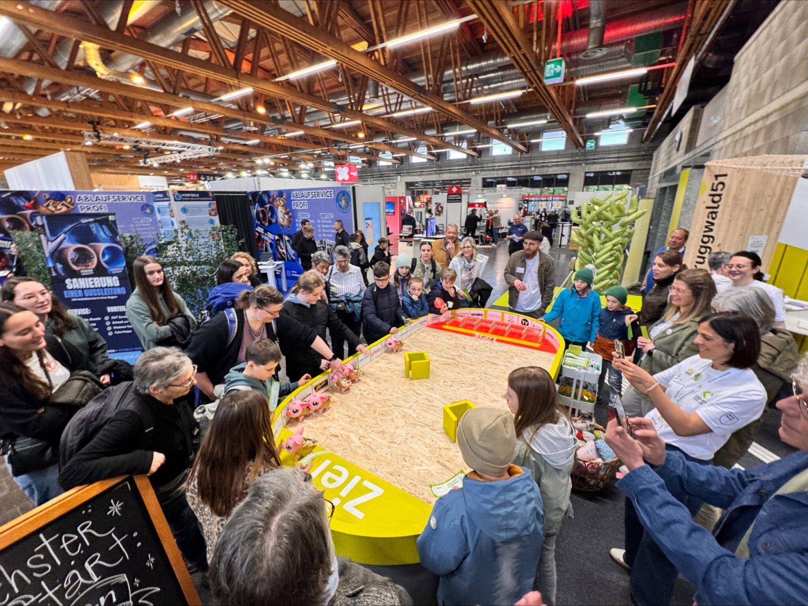 Eine Gruppe von Personen beobachtet und steuert kleine rosa Spielzeugroboter in einer geschlossenen Arena bei einer Indoor-Veranstaltung. Ein Kind beobachtet aufmerksam im Vordergrund, während die Mitarbeiter im Hintergrund helfen.
